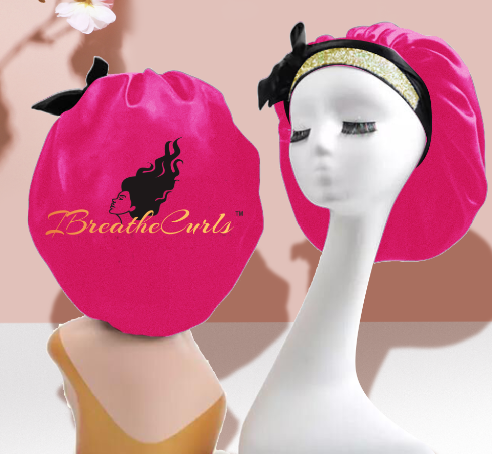IBreatheCurls™️ Luxury Hair Bonnets are satin, soft, protect hair, stay in place, and reduce frizz. (Available in Pink, Green, Royal Blue, Aqua, Gold, and Purple).